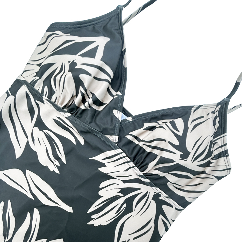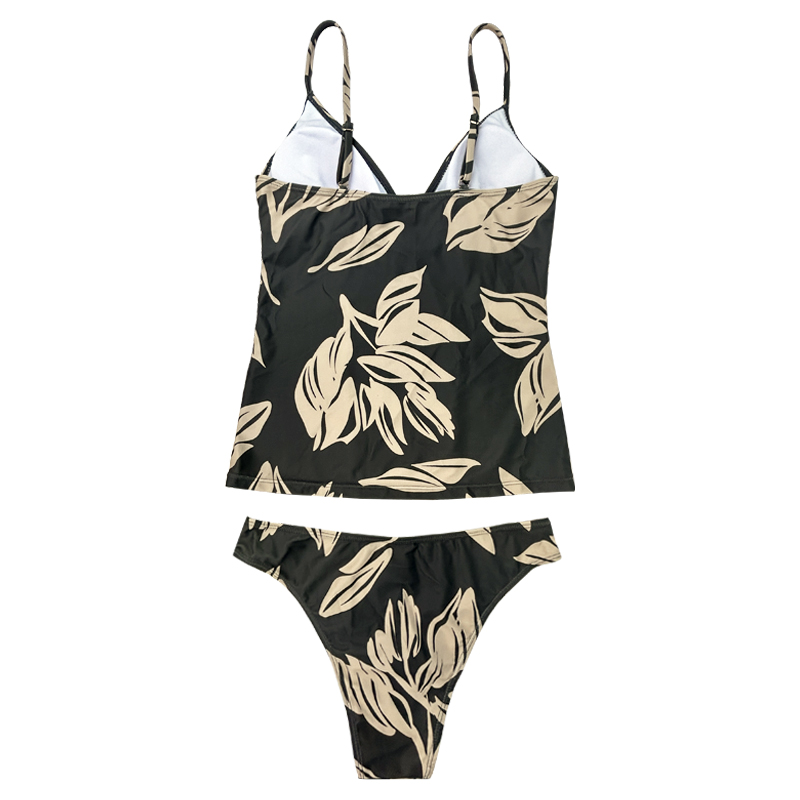 Chaleco de cordón con cordón de cordón plisado de hoja verde con cuello en V impresa traje de baño de dos piezas